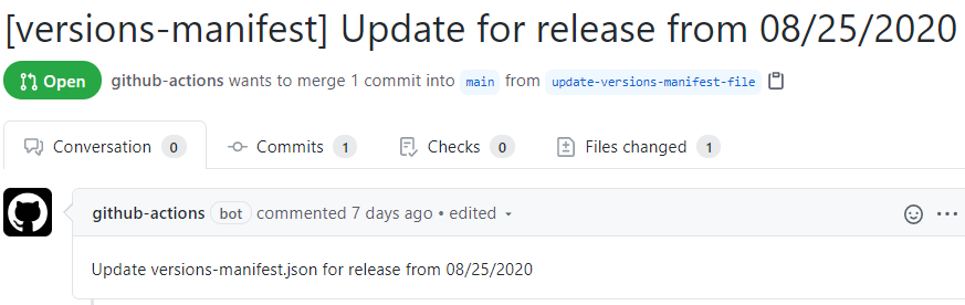versions-manifest.jsonfile. For this purpose we useGITHUB_TOKENwhich is automatically generated by GitHub. Example of PR created using a system account:Unfortunately, we were not able to get rid of the personal access token completely. We have to authenticate using a personal access token to trigger workflow configured with the